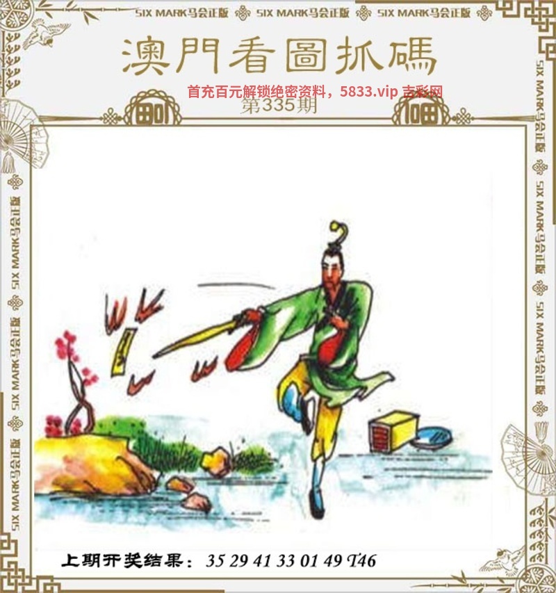 【妙解看图抓码】335期:图中有一位人物穿着绿色长袍和黄色裤子,扎着发髻,动作充满活力,有一张黄色的符咒或纸片在他身前飘动。 【看图抓码主看】:羊虎鸡狗兔猪 |